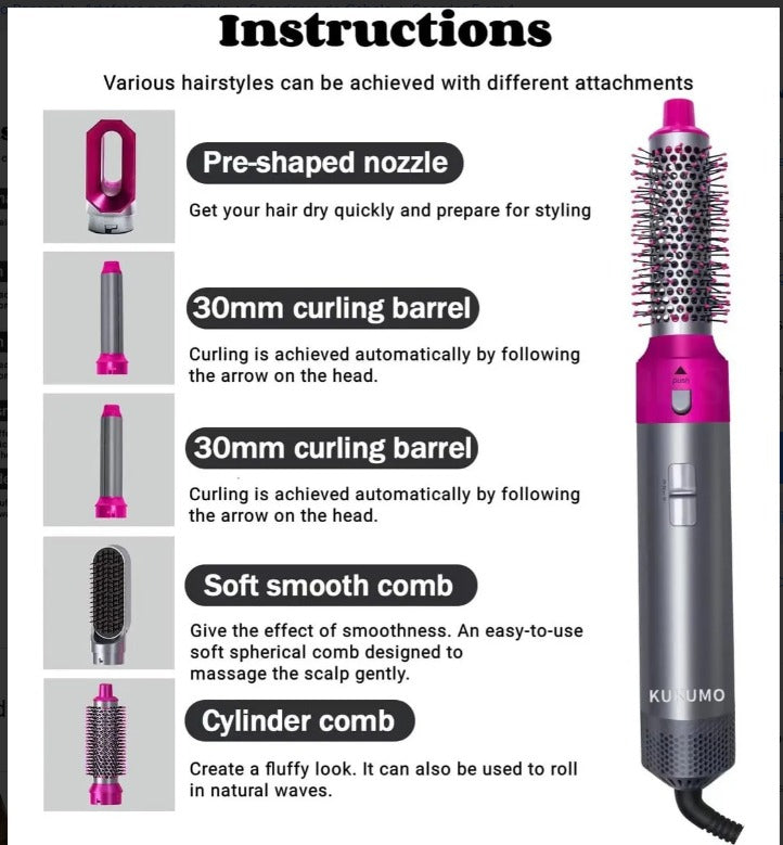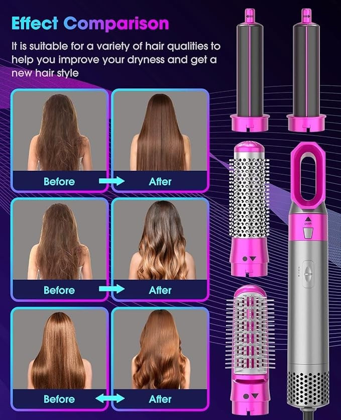 Este innovador dispositivo combina las funciones de un secador de pelo, cepillo de aire caliente, estilizador de cabello liso, peine rizador esponjoso y secador de pelo de iones negativos, todo en uno.